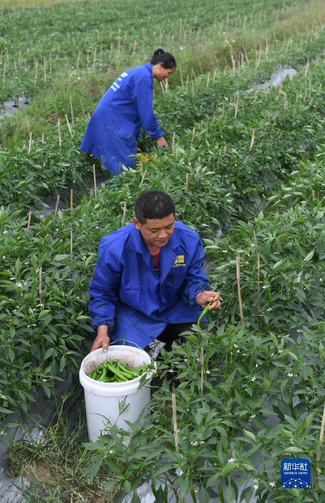 11월 4일, 광서 전동현(田东县) 평마진(平马镇) 백림촌(百林村) 촌민들이 시장에 내놓을 고추를 따고있다.