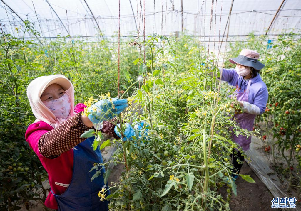 3월 20일 녕하회족자치구 은천시 하란현 습강진의 한 시설농업 단지 내 과일채소 비닐하우스 안에서 농민들이 방울토마토 가지치기를 하고 있다. 이날 24절기 중 춘분을 맞아 각 지 농민들이 봄 농사철을 놓힐세라 들녘에서 농사일을 서두르고 있다.
