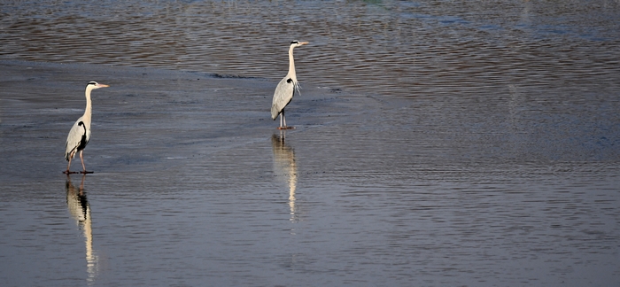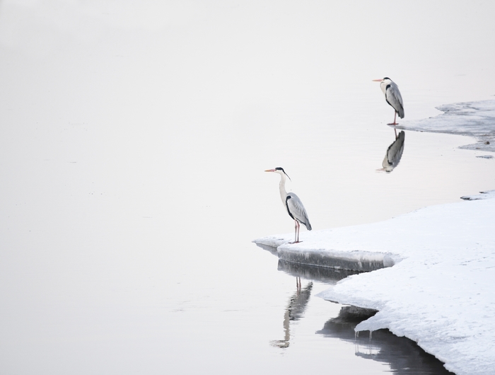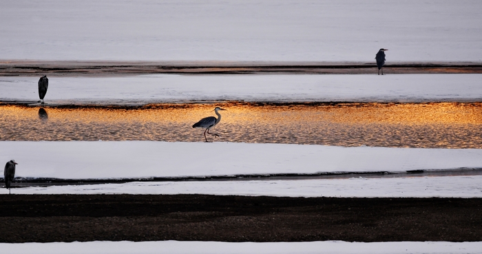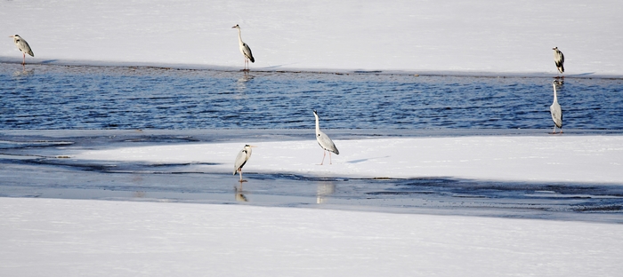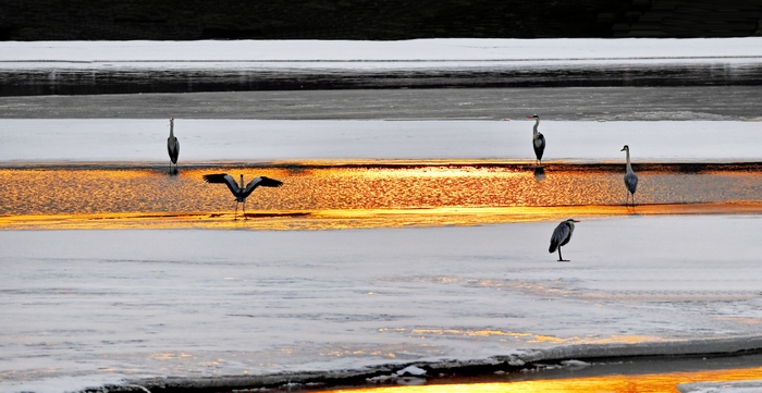 반쯤 풀린 강 얼음 우에서 약 100 마리의 큰 새들이 활동하고 있었다. 얼음 우에 서서 꼼짝하지 않고 수면을 바라보고 있는 새가 있는가 하면 서로 장난치다가 날개짓을 하며 선녀처럼 하늘로 날아오르는 새도 있었고 갑자기 물속에서 살찐 물고기를 낚아채 새무리에서 소동이 일어나기도 한다…