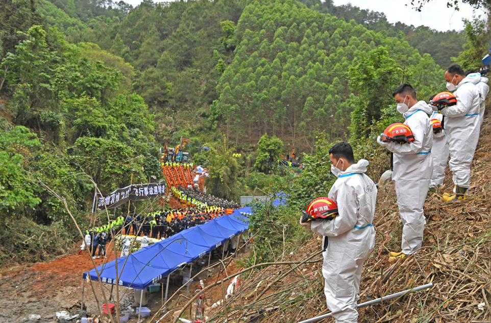 3월 27일 14시쯤 애도행사가 시작되였고 경적이 울리는 가운데 '3·21' 동방항공 MU5735 려객기 비행사고 국가응급대응지휘부 전원과 사고현장 수색구조 요원 등이 조난 려객기를 마주해 숙연한 자세로 서서 3분 동안 조난자에 대한 애도의 마음을 전했다.