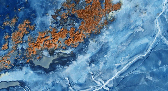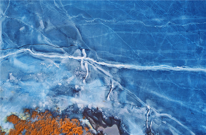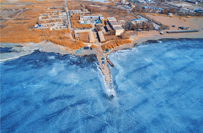 신강(新疆) 파음곽릉몽골(巴音郭楞蒙古)자치주 화석(和碩)현 금사탄(金沙灘)에 겨울 내내 꽁꽁 얼었던 박스등(博斯騰)호 빙판이 녹기 시작하면서 얼음이 깨진 흔적들이 호수를 수놓고 있다. 하늘에서 내려다보면 하늘빛을 머금은 맑고 푸른 빙판과 호숫가의 금빛 갈대가 어우러져 강한 색채 대비를 이루는 풍경이 시선을 사로잡는다. 박스등호는 중국 최대의 내륙 담수호이자 신장 최대의 어업 생산지로 유명하다.
