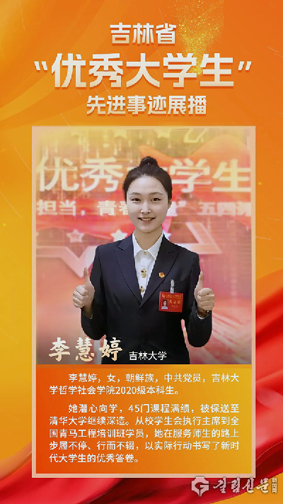 11월 26일 밤, 길림성교육청 소속 ‘길림교육' 위챗 공식계정에는 〈본보기의 힘―길림성 ‘우수대학생’ 선진사적 전시방송〉이라는 기사 한편이 발표된 가운데 길림대학 학생회 집행회장 조선족 리혜정학생의 사진과 사적이 제일 첫사람으로 소개되였다.