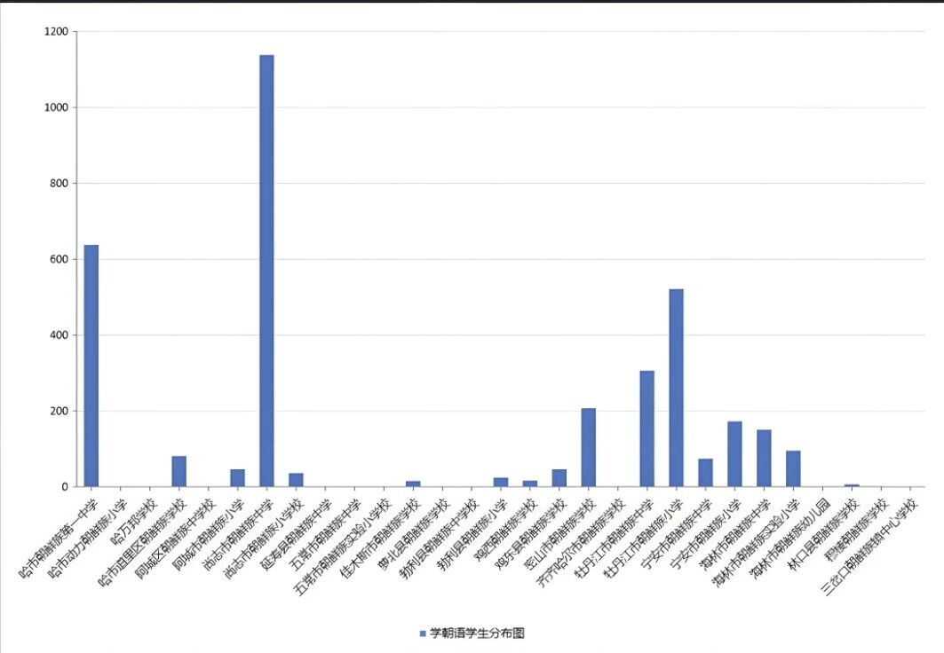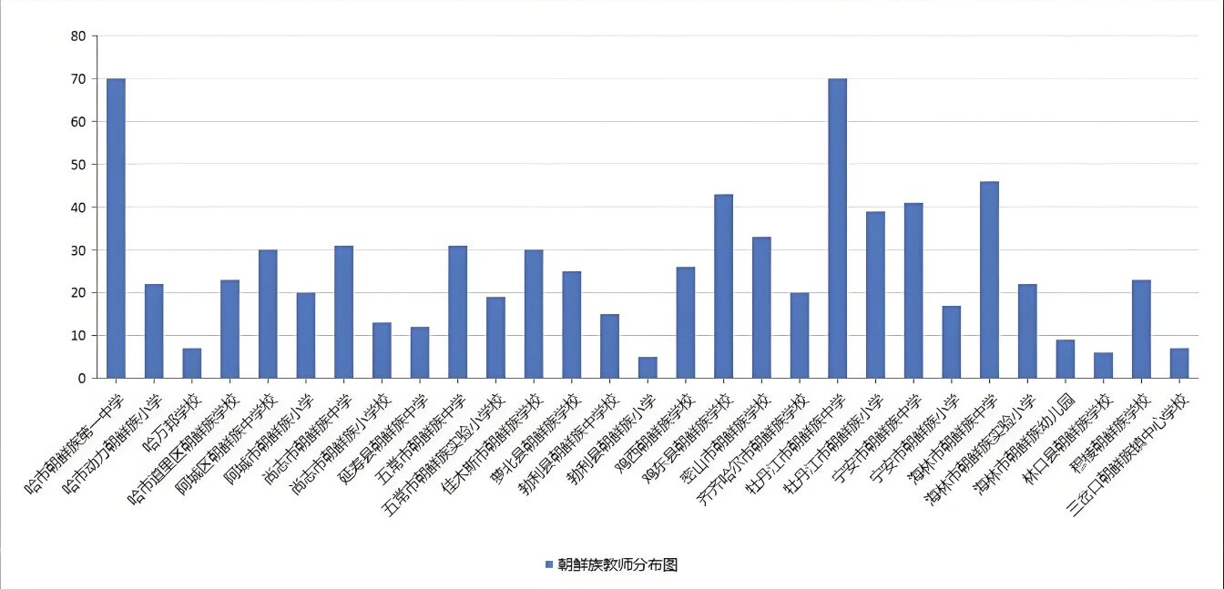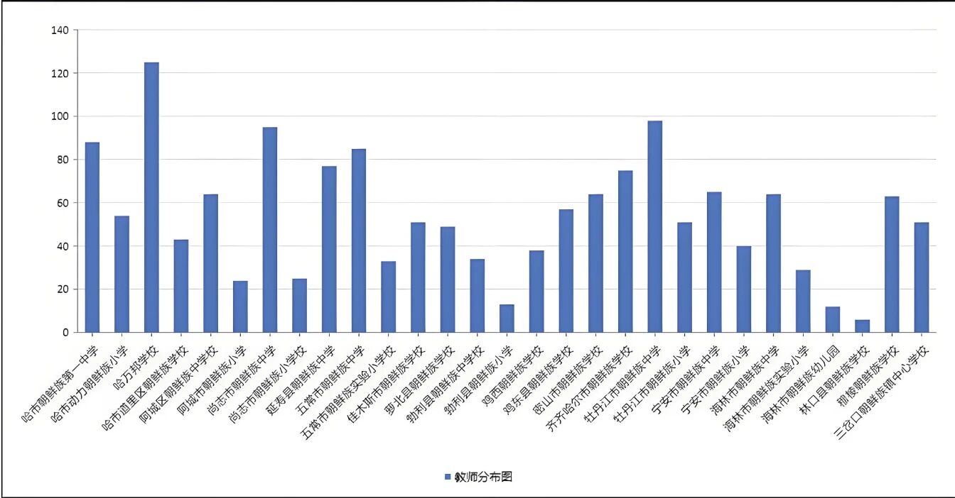 조선족 학생이 50명이상 100명 미만 학교로는 오상시조선족중학교(82명), 오상시조선족실험소학교(57명), 상지시조선족중학교(65명), 가목사시조선족학교(70명), 밀산시조선족학교(55명), 할빈동력조선족학교(47명)가 있고 그외 학교들은 50명 미만으로 조사됐다.전성 교사 총수는 1573명으로 그중 조선족교사가 755명으로 48% 차지한 것으로 집계됐으며 조선어교원은 62명으로 교사 총수의 4%, 조선족 교사 총수의 8% 가량으로 집계됐다. 현재 조선어문 학과목을 개강 못한 학교로는 할빈시만방학교, 연수현조선족중학교, 아성구조선족중학교, 오상시조선족중학교, 오상시조선족실험소학교, 라북현조선족학교, 벌리현조선족중학교, 목릉시조선족학교, 동녕시삼차구조선족진중심학교, 해림시조선족유치원으로 파악됐으며 기타 학교들에서는 부동하게 조선어학과목을 개강하고 있는 것으로 입수됐다.