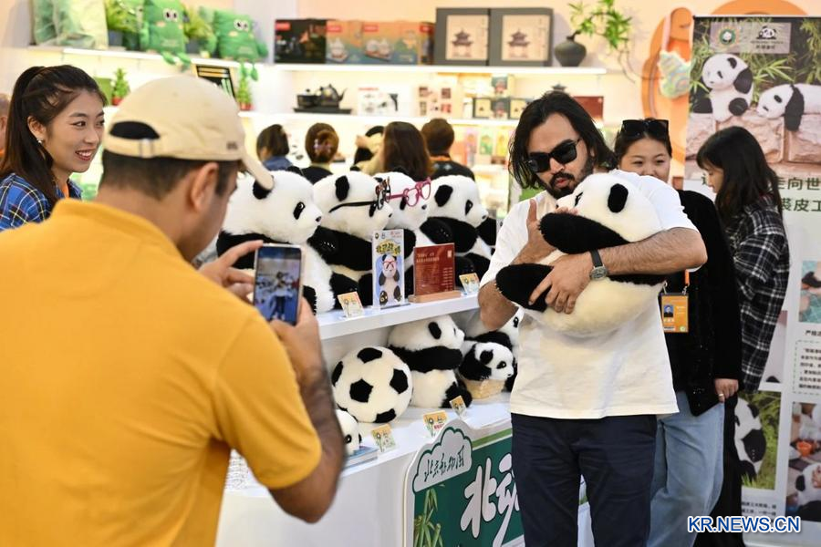 지난해 9월 16일 '중국국제서비스무역교역회(CIFTIS)' 전시장에서 북경동물원이 출시한 자이언트판다 인형을 안고 있는 외국인 관람객.
