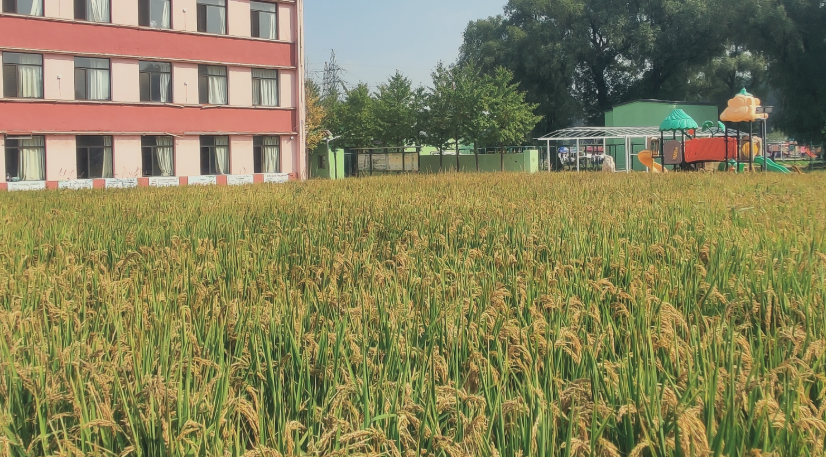 료양시조선족학교 1,100여평방메터의 홍석류 농장에 가을 바람에 넘실거리는 '황금 바다'가 교정의 아름다움과 풍년의 기쁨을 드러내고 있다.