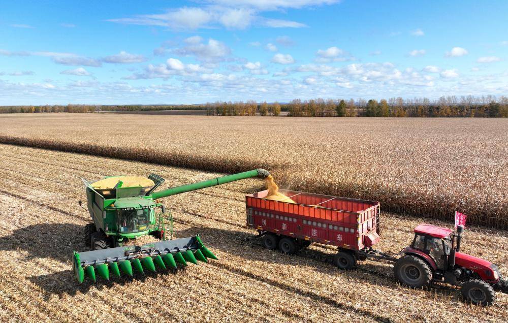 10월 8일, 북대황그룹 흑룡강 격구산 농장 유한회사의 옥수수 밭에서 농기계가 곡물을 수확하고 있다.(드론 사진, 륙문상 찍음)