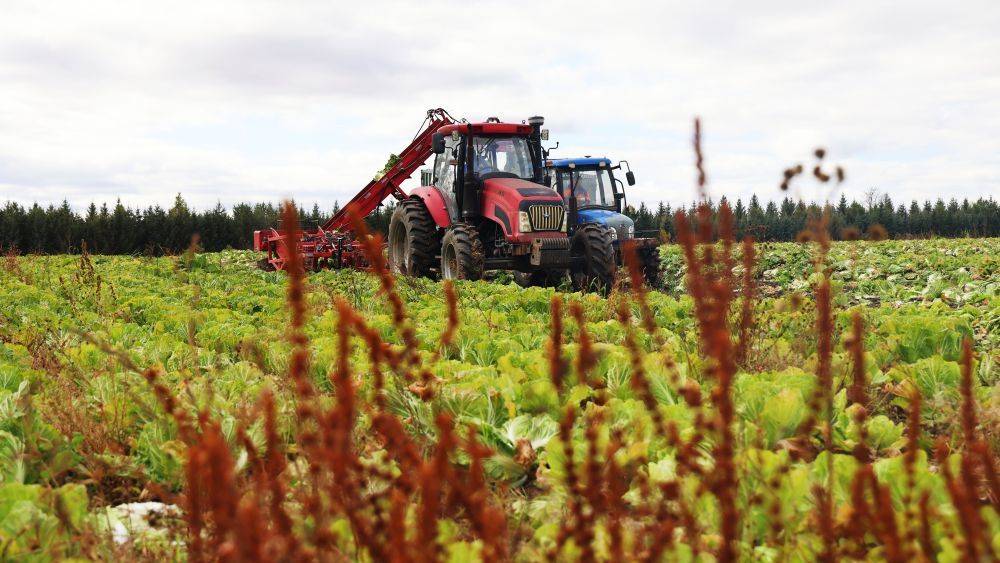 10월 8일, 북대황그룹 흑룡강 홍성농장 제4관리구역에서 농기계가 배추를 수확하고 있다. (후월 찍음)