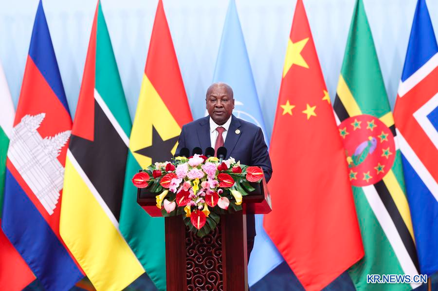 존 마하마 가나 대통령이 13일 '글로벌 녀성 서밋' 개막식에서 축사를 전하고 있다. (사진/신화통신)