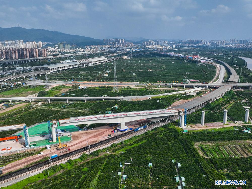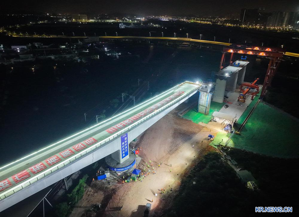 10일 심강(深江· 심천-강문)철로 광중강(廣中江·광주~중산~강문)특대교 광주(廣珠·광주~주해) 화물 운송 철도의 회전교 회전 작업이 성공적으로 완료됐다. 회전교 무게는 1만1천216t(톤), 교량 길이는 160m로 심강철로 핵심 관제 구간에 위치해 있다.