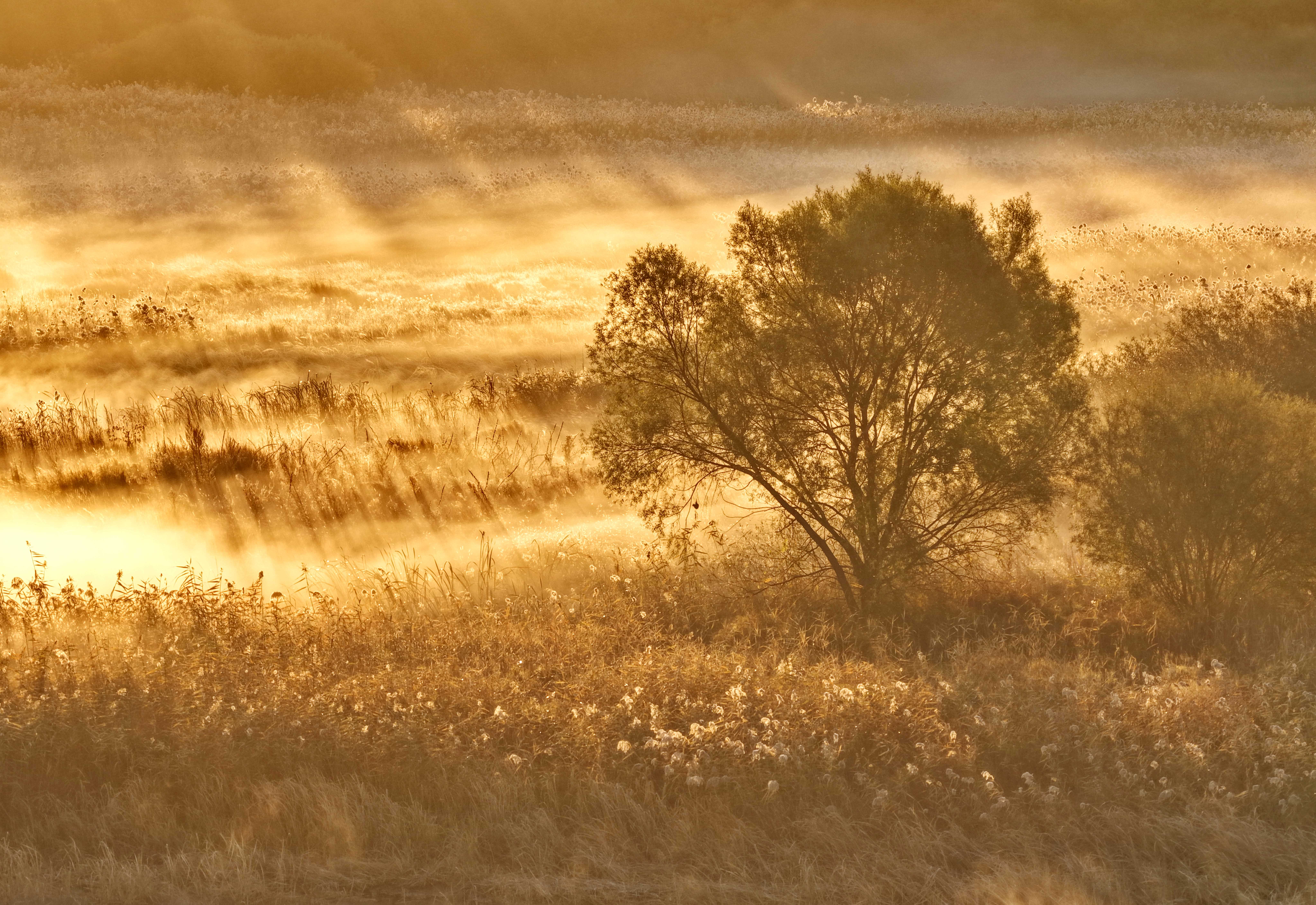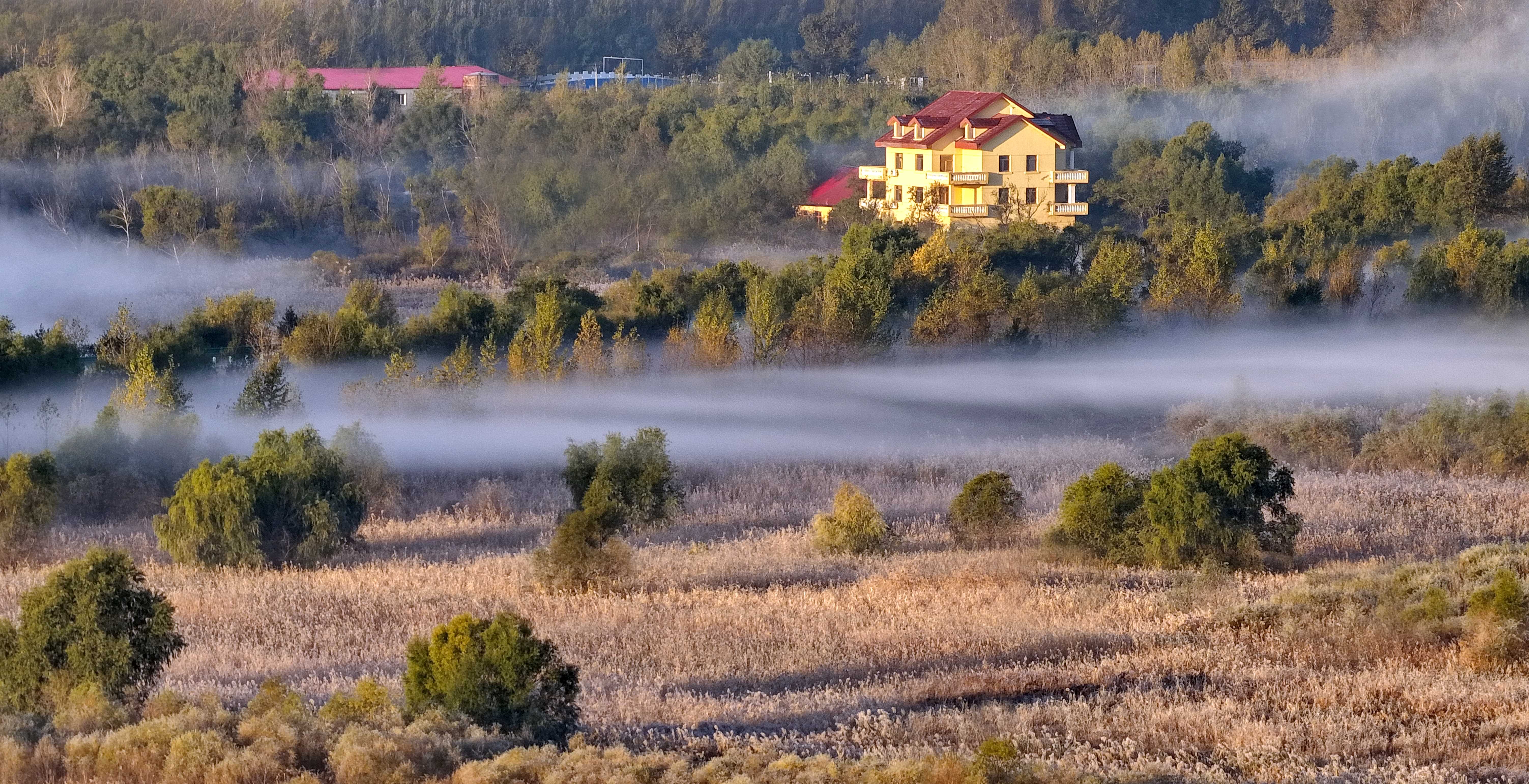 아침햇살이 비치는 가운데 연분홍빛 안개가 서서히 피여오르면서 교외의 알록달록한 가을색에 가벼운 가운을 드리워준다. 물새들이 날아예고 먼 곳의 도시 건물과 거리들이 어렴풋이 보인다. 마치 몽환적인 수채화를 방불케 한다.