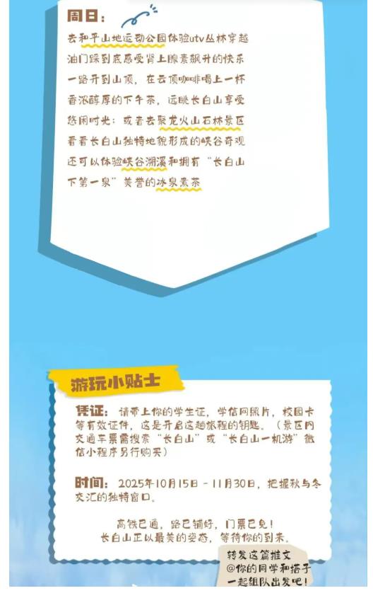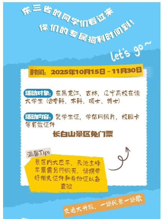 10월 15일부터 11월 30일까지 장백산풍경구는 동북3성(흑룡강, 길림, 료녕)에서 재학중인 대학생들에 대해 입장료면제정책을 실시한다.