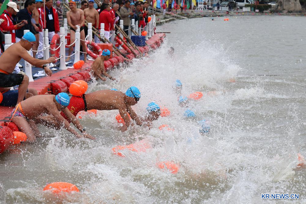 '제3회 홍택호(洪澤湖) 수영대회 및 천인(千人) 게 미식회'가 19일 강소(江蘇)성 회안(淮安)시 홍택호 어인만(漁人灣)에서 열렸다.
