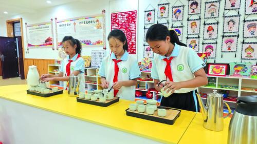 훈춘시제4소학교에서 중화민족공동체의식 확고히 수립을 일상의 교수에 융합시키고 직관적인 교수방식으로 학생들의 민족 긍지감을 높여주고 있다. 사진은 학생들이 중국 다도전통문화를 배우는 모습이다.