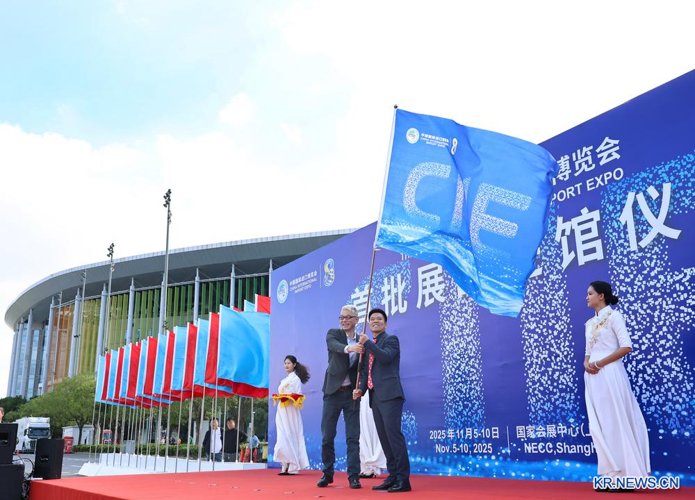 23일 '제8회 중국국제수입박람회(CIIE)' 첫 번째 전시품 입관행사 현장에서 기업 대표가 박람회 깃발을 흔들고 있다. '제8회 CIIE'의 첫 번째 전시품 입관행사가 이날 국가컨벤션센터(상하이)에서 열렸다. 기술장비, 농산품·식품, 의료 전시구역 중심으로 본격적인 전시품 배치가 시작됐다.