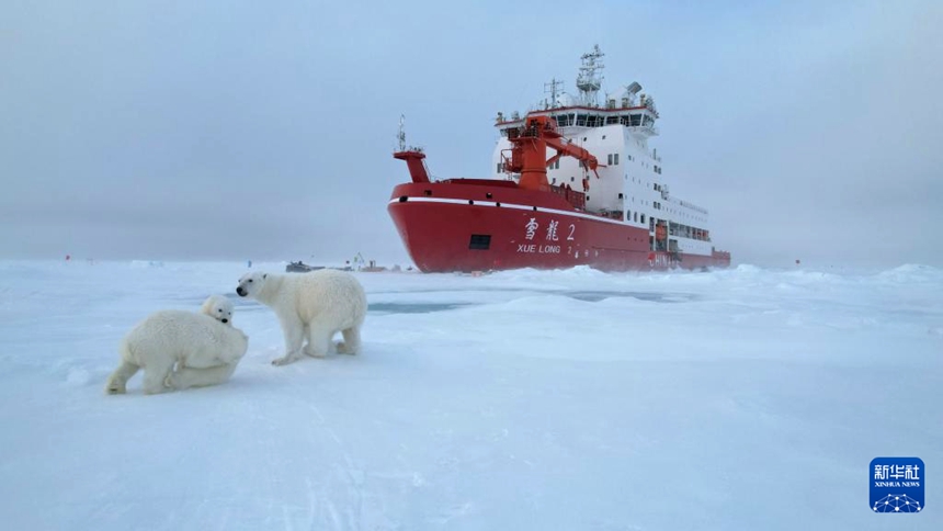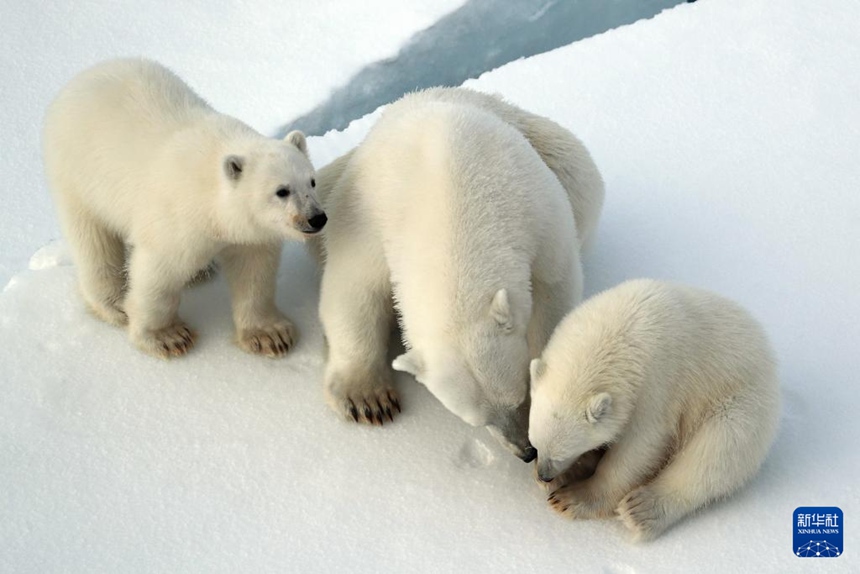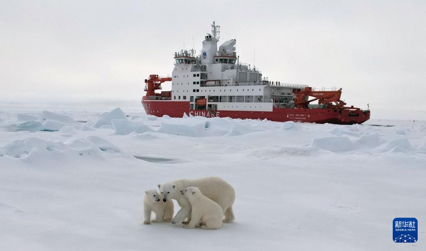 8월 30일 밤, 중국 제15차 북극해 과학탐사팀의 장기 해빙 관측 작업이 종료되기 하루 전, 한 어미 북극곰이 두 마리 새끼를 데리고 탐사팀원들이 탑승한 ‘설룡(雪龍) 2’호 극지 과학탐사 쇄빙선 주변에 모습을 드러냈다.