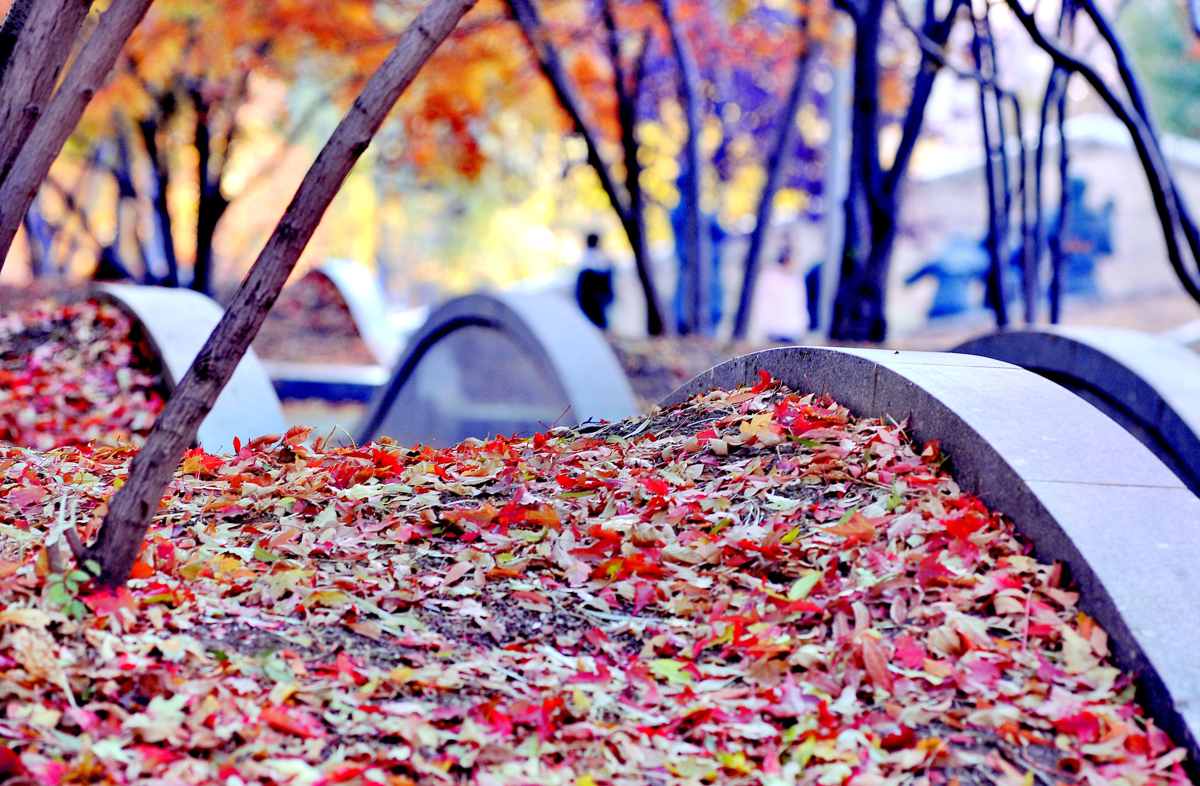 빨간색, 보라색, 노란색, 초록색 등 다양한 색갈의 락엽들이 층층이 쌓여 도시에 아름다운 풍경을 더하고 있다.