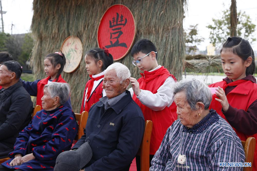26일 강소성 해안(海安)하이테크산업개발구에서 어린이 자원봉사자들이 로인의 머리를 다듬어주고 있다.
