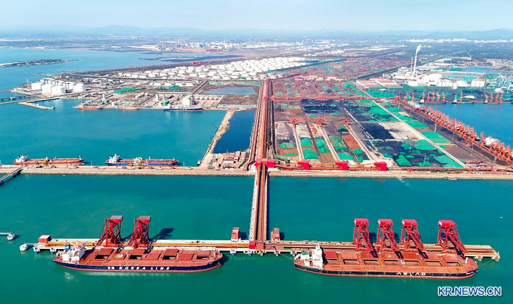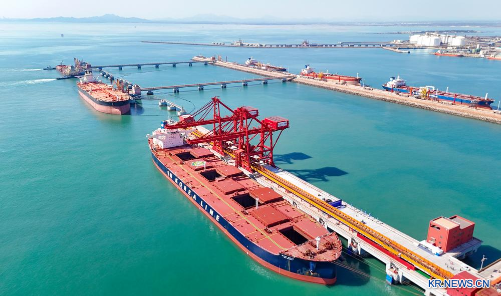 27일 산동(山東)성 청도(青島)항구의 두 번째 40만t(톤)급 광석부두를 드론 사진에 담았다.