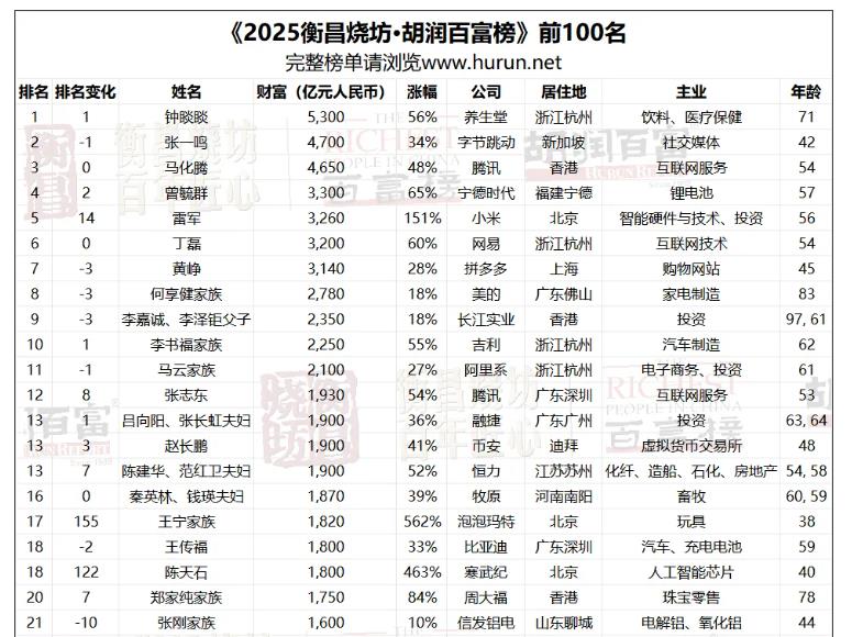 10월 28일, 2025년 후룬 100대 부자 순위에 따르면 종섬섬(钟睒睒)이 장일명을 제치고 5300억원의 몸값으로 중국 최고의 부자로 등극했다고 한다.