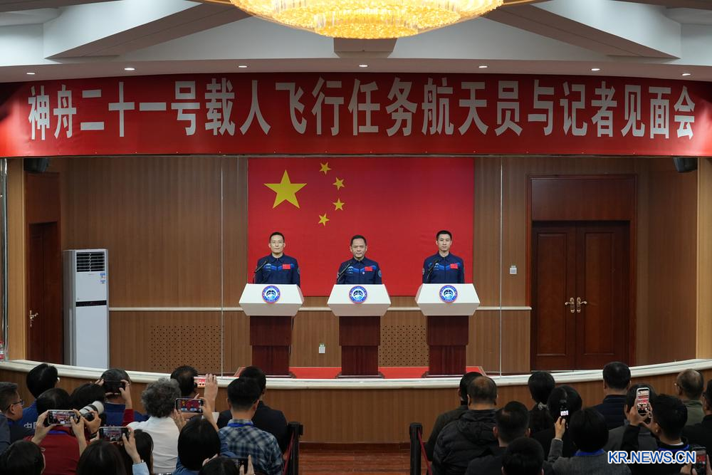 30일 중국 유인우주선 신주(神舟) 21호 우주인 장륙(張陸·가운데), 무비(武飛·오른쪽), 장홍장(張洪章)이 감숙(甘肅)성 주천(酒泉)위성발사센터 문천각(問天閣)에서 기자간담회를 가졌다.