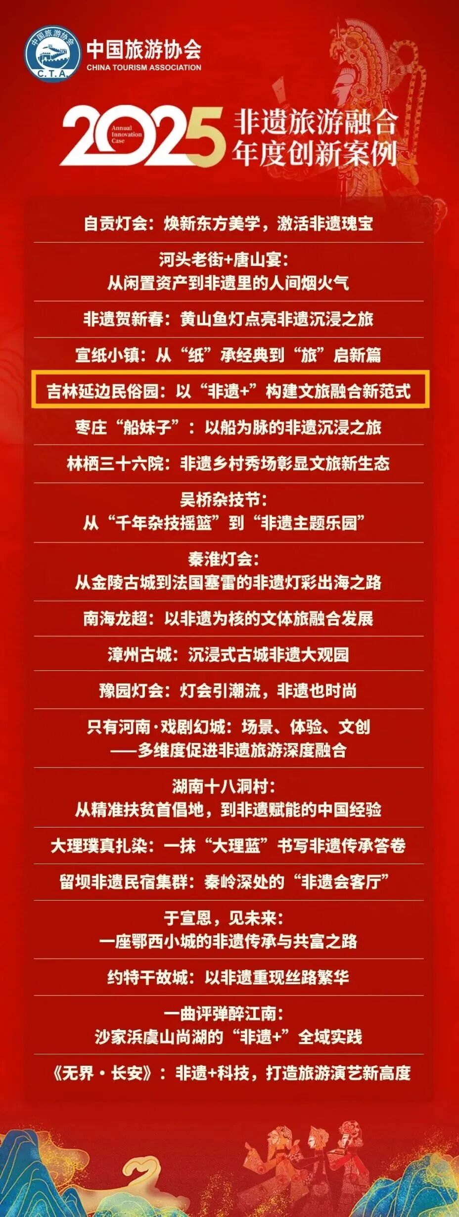10월 30일, 문화관광부 비물질문화유산사가 조직하고 중국관광협회와 하북성 문화관광청이 주최한 ‘비물질문화유산 관광융합혁신 교류활동’이 하북성 당산에서 개최되였으며 회의에서 전국 20개의 ‘2025 비물질문화유산 관광융합 년도 혁신 사례’가 공식 발표되였다. <길림 연변민속원: ‘비물질문화유산+’로 문화관광융합의 새로운 패러다임 구축>이 성공적으로 선정되였는데 이는 동북3성에서 유일하게 선정된 사례이다.
