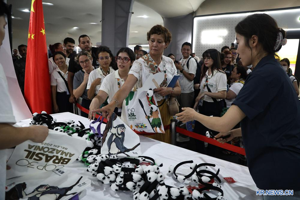 제30차 유엔기후변화협약(UNFCCC) 체결측 총회(COP30) 참가자들이 10일 '차이나 코너'에서 기념품을 수령하고 있다.