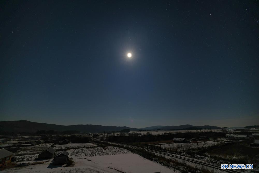 10일 밤과 11일 새벽 사이 목성과 쌍둥이자리에서 가장 밝은 별인 폴룩스(Pollux)가 달과 함께 떠올라 신비로운 정경을 연출했다. 11일 흑룡강성 이춘(伊春)시에서 포착한 달과 별의 어우러짐.