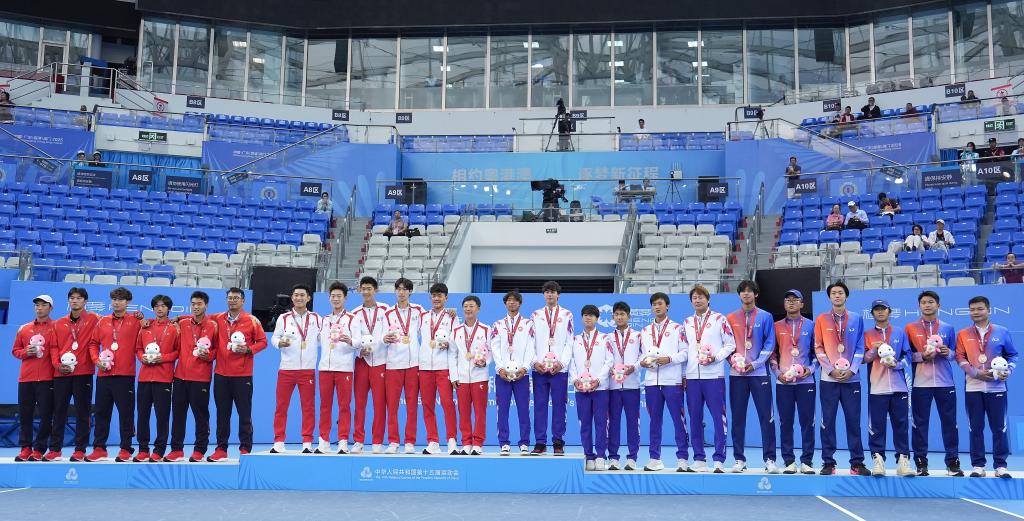 북경 테니스팀이 12일 광동성 횡금에서 열린 제15회 전국운동회 테니스 종목 청년부 남자 단체전 결승에서 강소 테니스팀을 2대 1로 꺾고 우승을 차지했다.