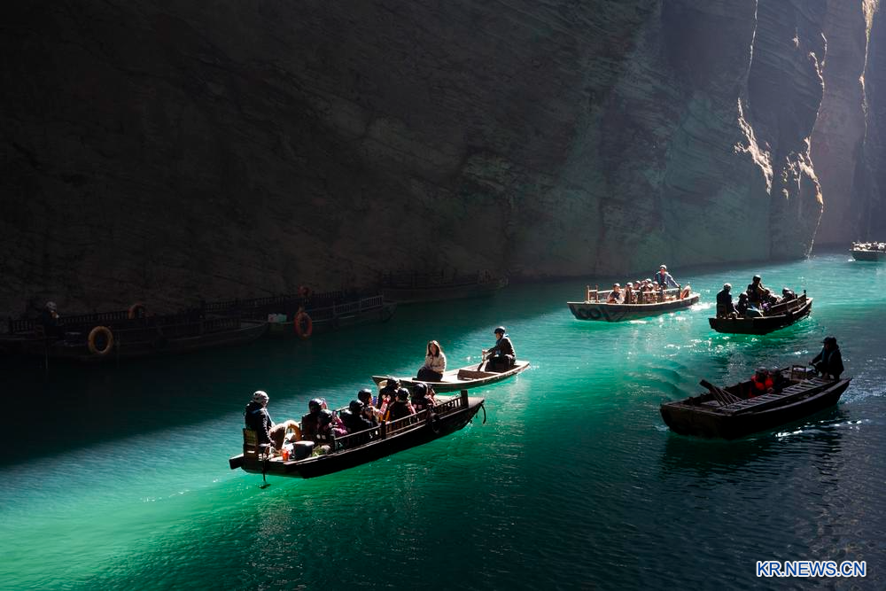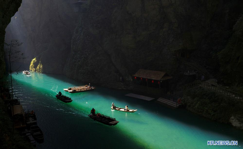 초겨울 정오 무렵, 호북(湖北)성 은시(恩施) 토가(土家)족 묘족(苗)족자치주 학봉(鶴峰)현 병산(屏山)협곡에 햇살이 비치면 맑은 물 위를 떠가는 배가 마치 공중에 떠 있는 듯한 착시를 일으키며 아름다운 풍경을 연출한다.