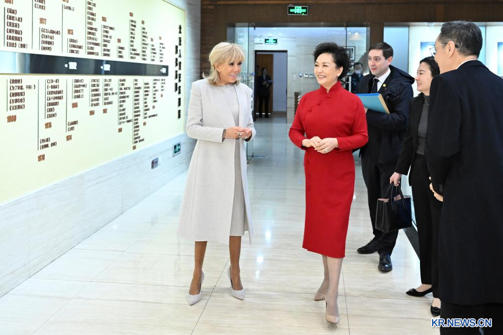 습근평(習近平) 중국 국가주석의 부인 팽려원(彭麗媛) 녀사가 에마뉘엘 마크롱 프랑스 대통령의 중국 국빈 방문에 동행한 브리지트 녀사와 4일 오전 북경 인민예술극장을 방문했다.