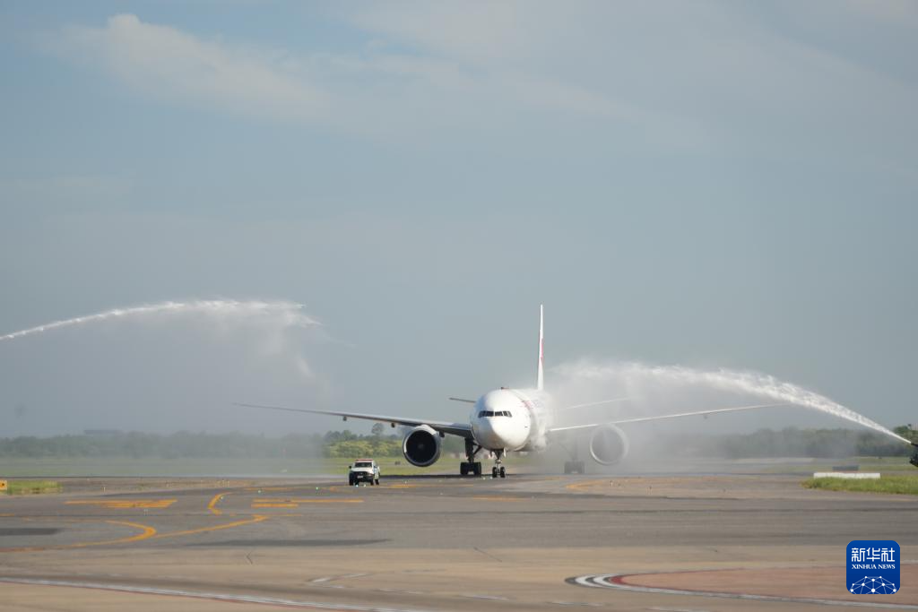 중국 동방항공의 MU745 편이 4일 아르헨티나 수도 부에노스아이레스의 에세르사 국제공항에 도착, 민간 항공의 최고 예의를 상징하는 '워터게이트'를 지나고 있다. 이는 중국과 아르헨띠나 량국 간의 첫 직항로가 개통되였음을 상징한다.