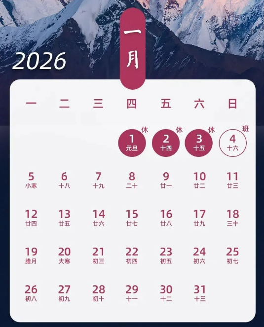 앞서 국무원 판공청이 발표한 2026년 일부 명절휴가일 배치에 관한 통지에 따르면 양력설 련휴는 다음과 같이 배치한다. 1월 1일(목요일)부터 3일(토요일)까지 총 3일간 조정휴식하고 1월 4일(일요일) 출근한다.