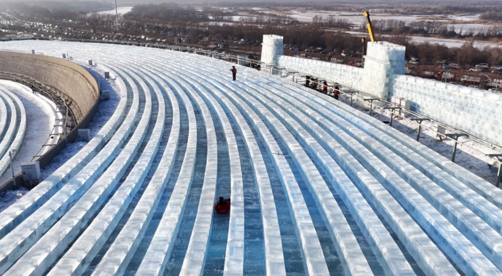 10여 일간의 건설을 거쳐, 할빈 빙설대세계의 인기 프로젝트인 슈퍼 얼음 미끄럼틀의 얼음 구조물이 완공되여 세부 점검과 시범 탑승 검사 단계에 들어갔다.