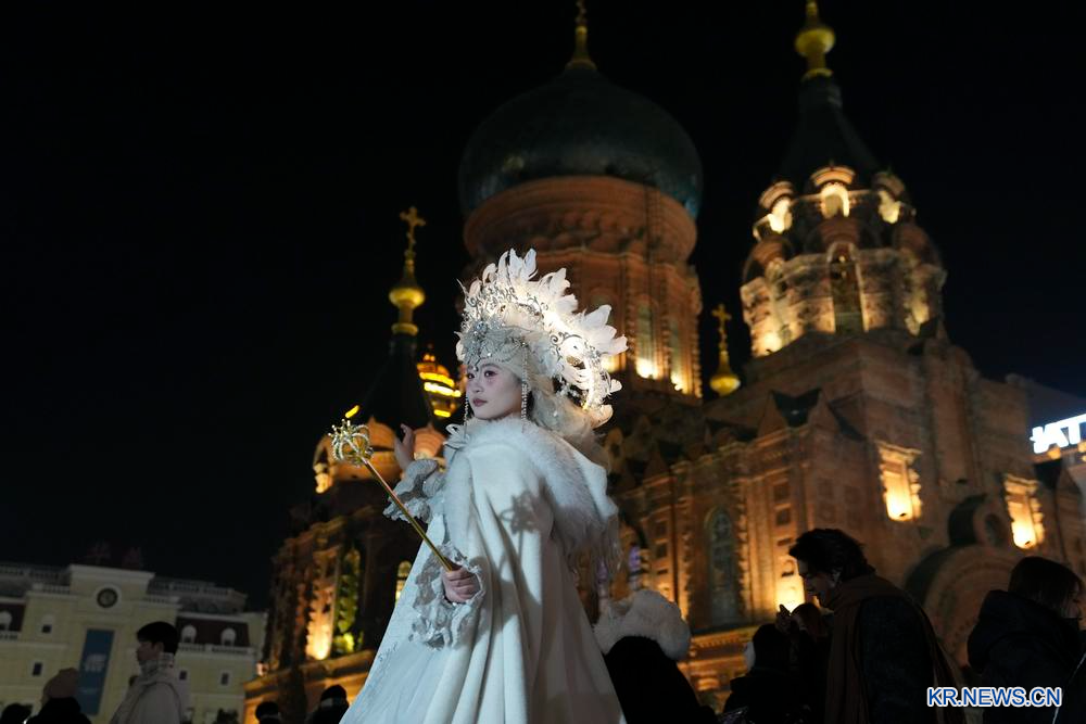 겨울철 흑룡강성 할빈건축예술광장에는 화려한 의상을 입은 사람들이 곳곳에서 사진을 찍으며 추운 겨울 속 랑만을 만끽하는 모습을 쉽게 볼 수 있다.