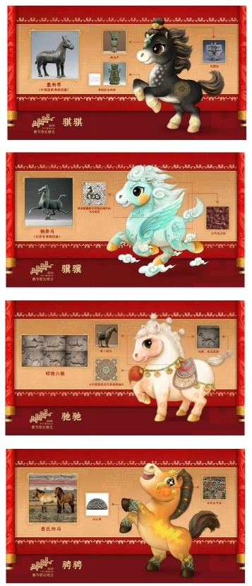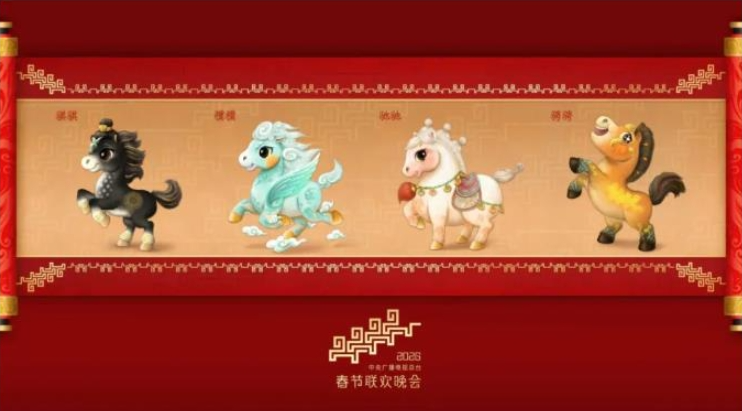 12월 18일, 중앙텔레비죤방송총국은 <2026년 음력설문예야회> 마스코트 이미지를 공개했다. ‘기기(骐骐)’, ‘기기(骥骥)’, ‘치치(驰驰)’, ‘빙빙(骋骋)’ 4마리 준마는 활발하고 사랑스러우며 의기양양한바 행사주제인 ‘천리마의 거침없는 질주는 막을 수 없다(骐骥驰骋 势不可挡)’와 일맥상통하며 서로 조화를 이룬다. 이 마스코트는 중국의 부동한 시기 말의 고전적인 자태에서 령감을 받아 디자인되였다. 여기에 류운(流云)무늬, 산운(山云)무늬 등 천년의 전통문양을 ‘입혀’ 면면히 이어지는 력사의 아름다움과 만물이 소생하는 새 시대의 기운을 생동감 있게 담아냈다. 또한 ‘마도성공(말이 닿자마자 성공함)’과 ‘전정사금(앞길이 비단처럼 펼쳐짐)’이라는 축복의 의미를 담고 있다.