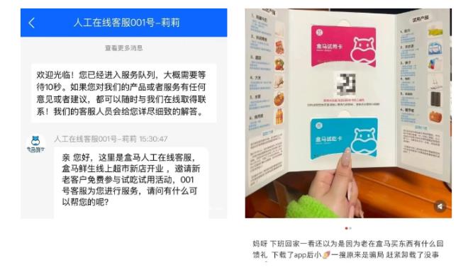 큐알코드를 스캔하면 고객센터페지로 련결된다. 고객상담원은 “허마샌성은 신규 및 기존 고객들을 시식행사에 참여하도록 초청한다”며 이름과 휴대폰번호, 배송지주소 등을 요구한다. 또 일부 고객상담원은 앱을 다운받도록 유도하기도 한다. 일부 네티즌들은 카드는 모양이 정교하고 진실해보였지만 큐알코드를 스캔한 후에야 이상한 것을 알아차렸다고 밝혔다.
