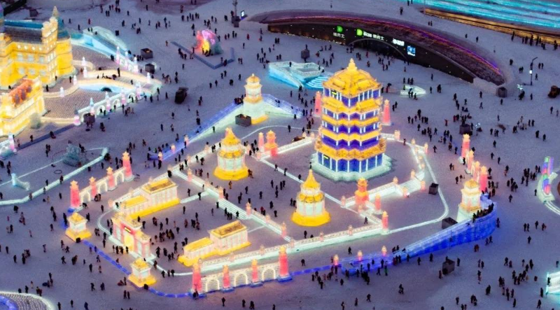 이번 겨울, 할빈 빙설대세계는 사상 처음으로 무한 황학루와 협업하여 빙설 기술로 강남의 명소를 북국의 '얼음 도시'로 옮겨왔다.