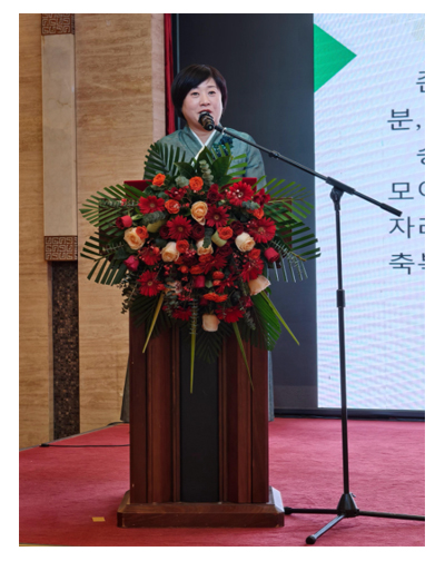 할빈시조선민족예술관 리춘실관장이 축사를 올리고 있다.