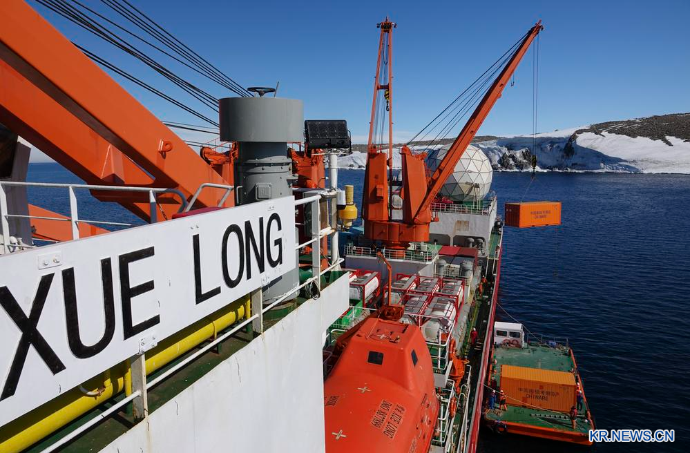 중국 극지 과학탐사 쇄빙선 '설룡호'가 29일 진령기지 해역에서 바지선에 물자를 싣고 있다.