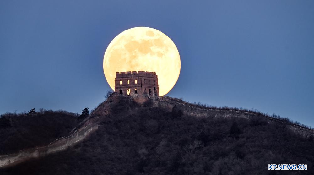 3일 북경시 밀운(密云)구 고북구(古北口)진 반룡산(蟠龙山) 장성에 떠오른 슈퍼문.