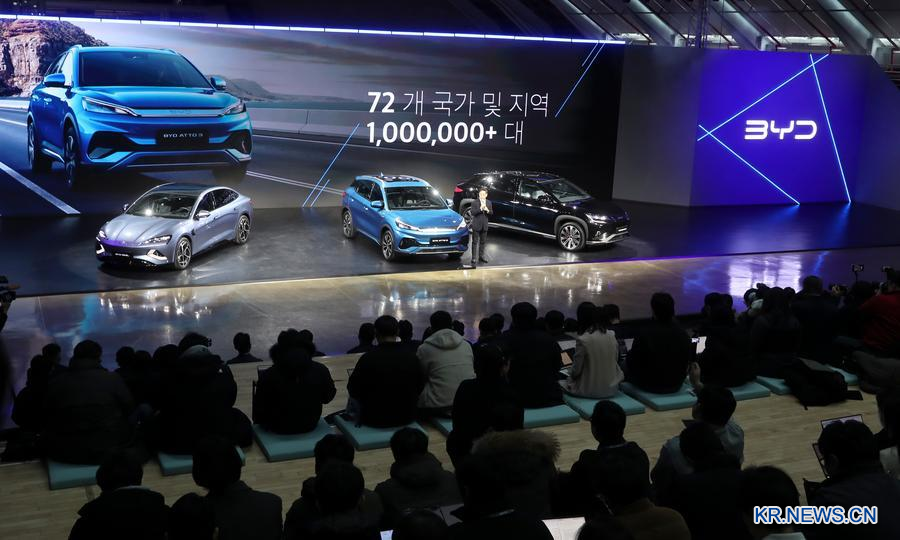2025년 1월 16일 인천서 열린 비야디(BYD) 브랜드 발표회에서 진행자가 한국 판매를 앞둔 BYD 3종 모델을 소개하고 있다. (사진/신화통신)