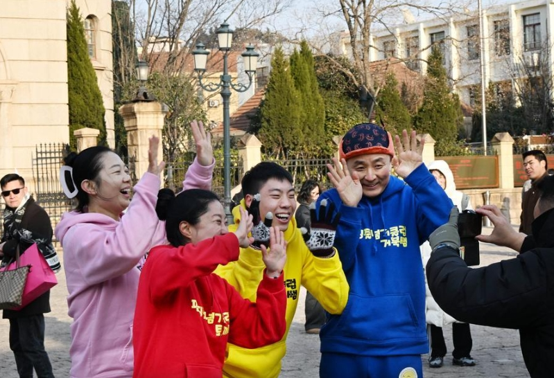 2025년 12월 31일 한국 관광객들이 청도시 시남(市南)구에서 새해 축하 영상을 촬영하고 있다.