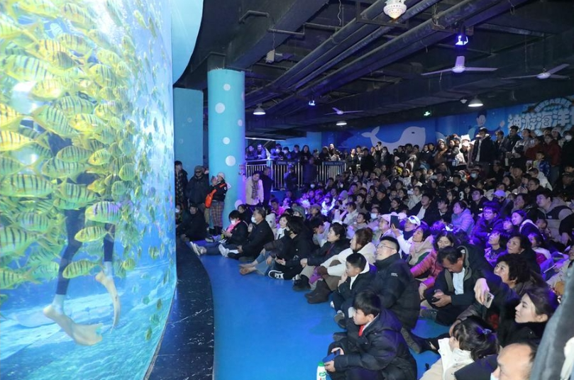 지난 2일 산동성 위해시에 위치한 화하성(華夏城) 신유(神遊)해양세계에서 수중 공연을 관람하는 한국인 단체관광객.
