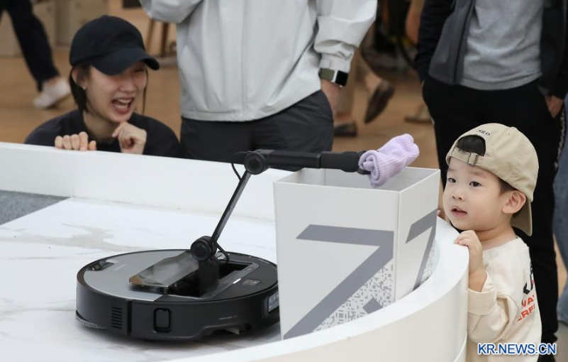 2025년 10월 12일 서울 근교의 한 대형 쇼핑몰에서 한국 소비자들이 로봇청소기의 시연을 구경하고 있다.