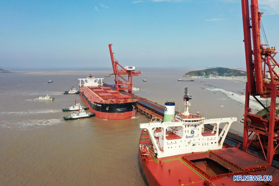 절강(浙江)성 닝보(宁波)저우산(舟山)항 서랑호(鼠浪湖) 광석 환적 부두에 40만t(톤)급 광석선 두 척이 정박해 있다. /신화통신