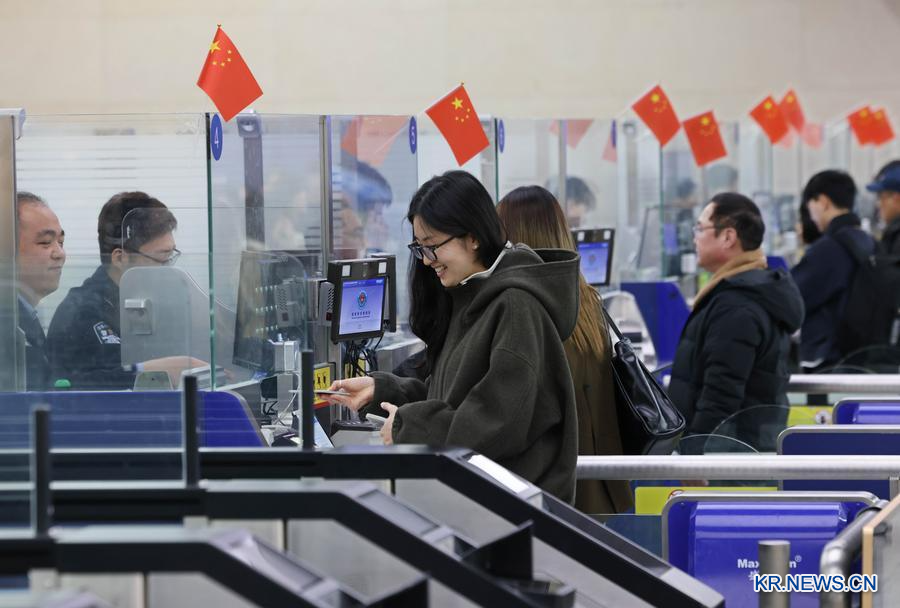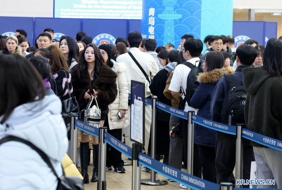 2025년 12월 31일 청도공항에서 이민관리 경찰이 한국에서 온려행객들을 대상으로 입경 수속을 진행하고 있다. /신화통신
