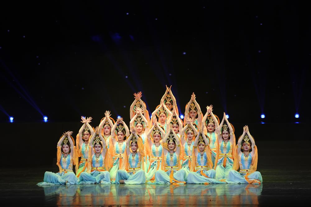 7일 감숙(甘肅)성 주천(酒泉)시 문화관 공연자들이 돈황(敦煌)춤을 선보이고 있다. "감숙성 대중 문예 전시회"가 이날 저녁 란주(蘭州) 음악청에서 첫 공연을 가졌다. 이번 행사는 "온·오프라인", "공연+방송" 등 다양한 방식으로 대중에게 다가가는 문예 무대를 만들어 나갈 예정이다.
