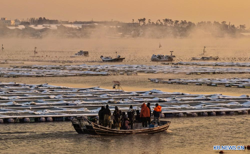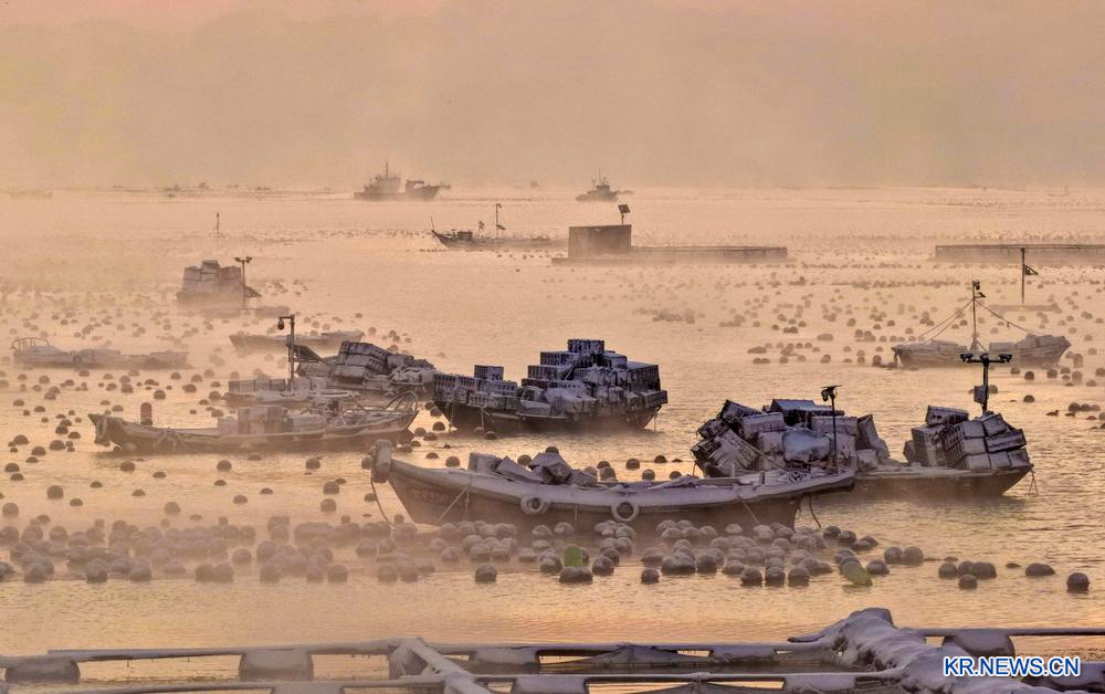 12일 산동(山東)성 영성(榮成)시 애륜만(愛倫灣) 해양목장에 물안개가 피어올랐다. 해수면의 증발된 수증기가 찬 공기와 만나 응결되면서 하얀 안개 형태로 생성된 모습이 마치 끓어오르는 물과 같아 신비로운 정경을 선사한다.