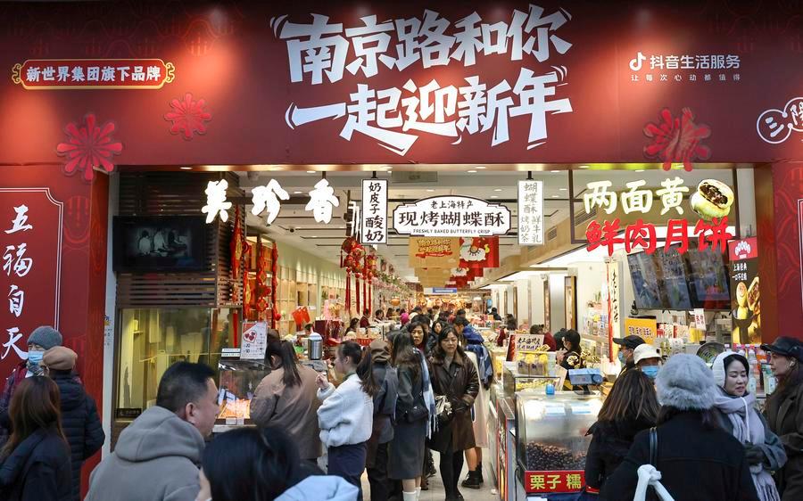 지난 3일 상해 남경로(南京东路) 보행자거리를 찾은 시민과 관광객들이 한 전통 식품 판매점에서 쇼핑을 하고 있다. /신화통신