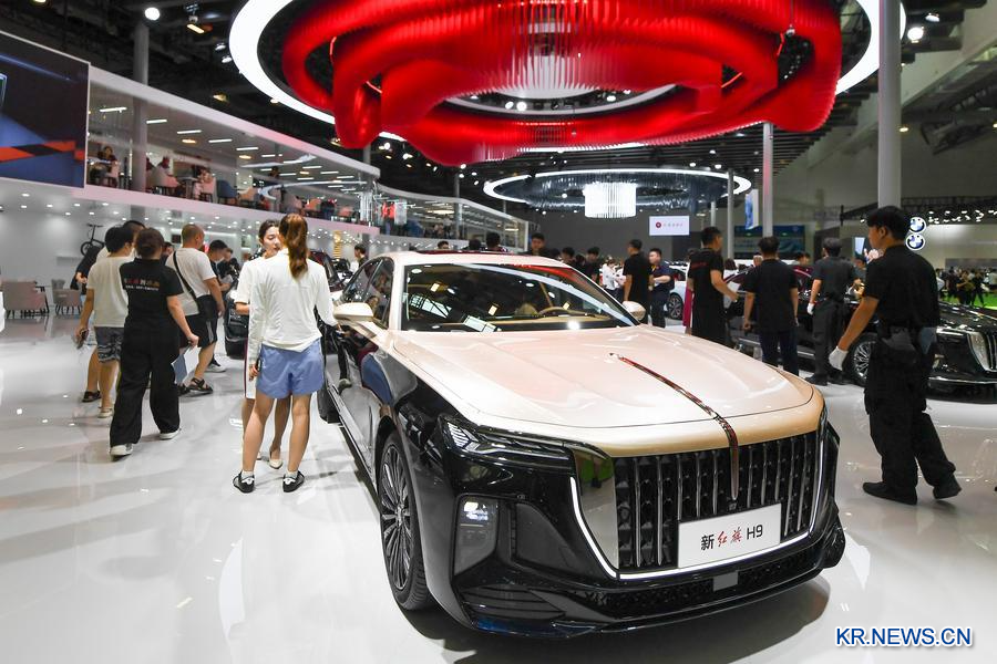 2025년 7월 12일 '제22회 장춘국제자동차박람회'를 찾은 시민들이 홍기(红旗)브랜드 전시구역을 관람하고 있다. /신화통신